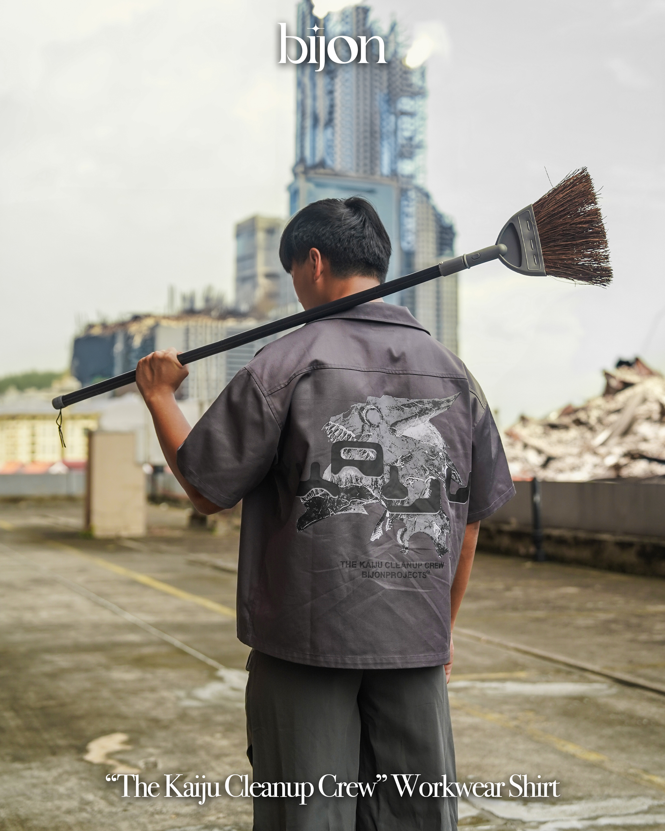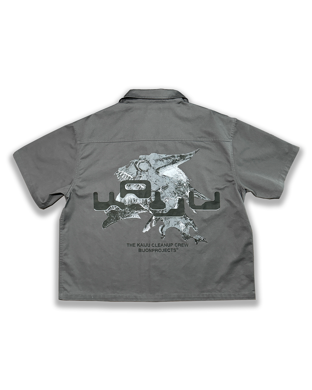 The Kaiju Cleanup Crew Workwear Shirt is inspired by the unsung heroes of Kaiju No. 8: the Monster Sweepers Inc., a team that cleans up the aftermath of epic kaiju battles. Paying homage to their mostly unrecognized efforts, this durable, oversized workwear shirt blends functionality with anime-inspired design.