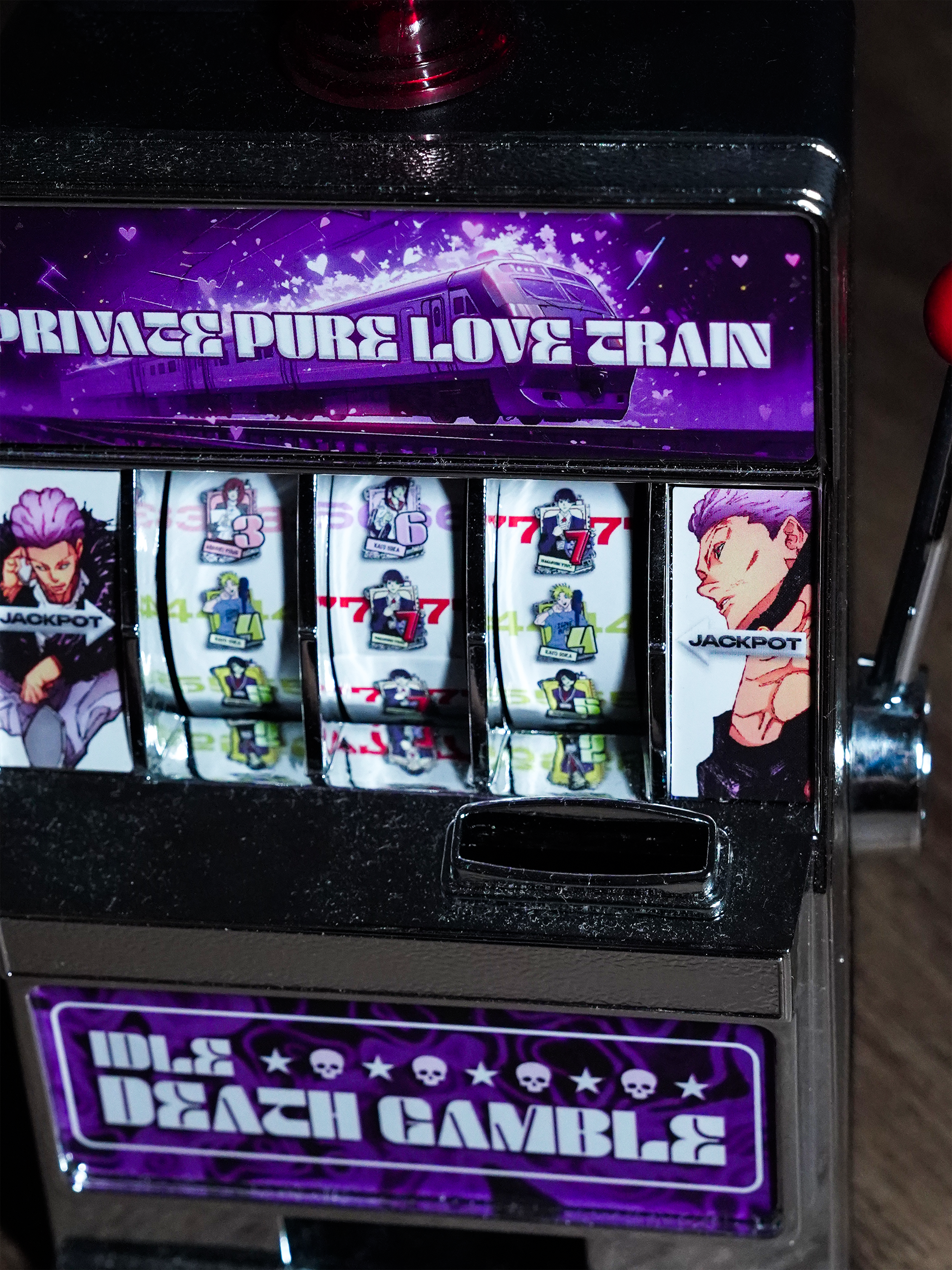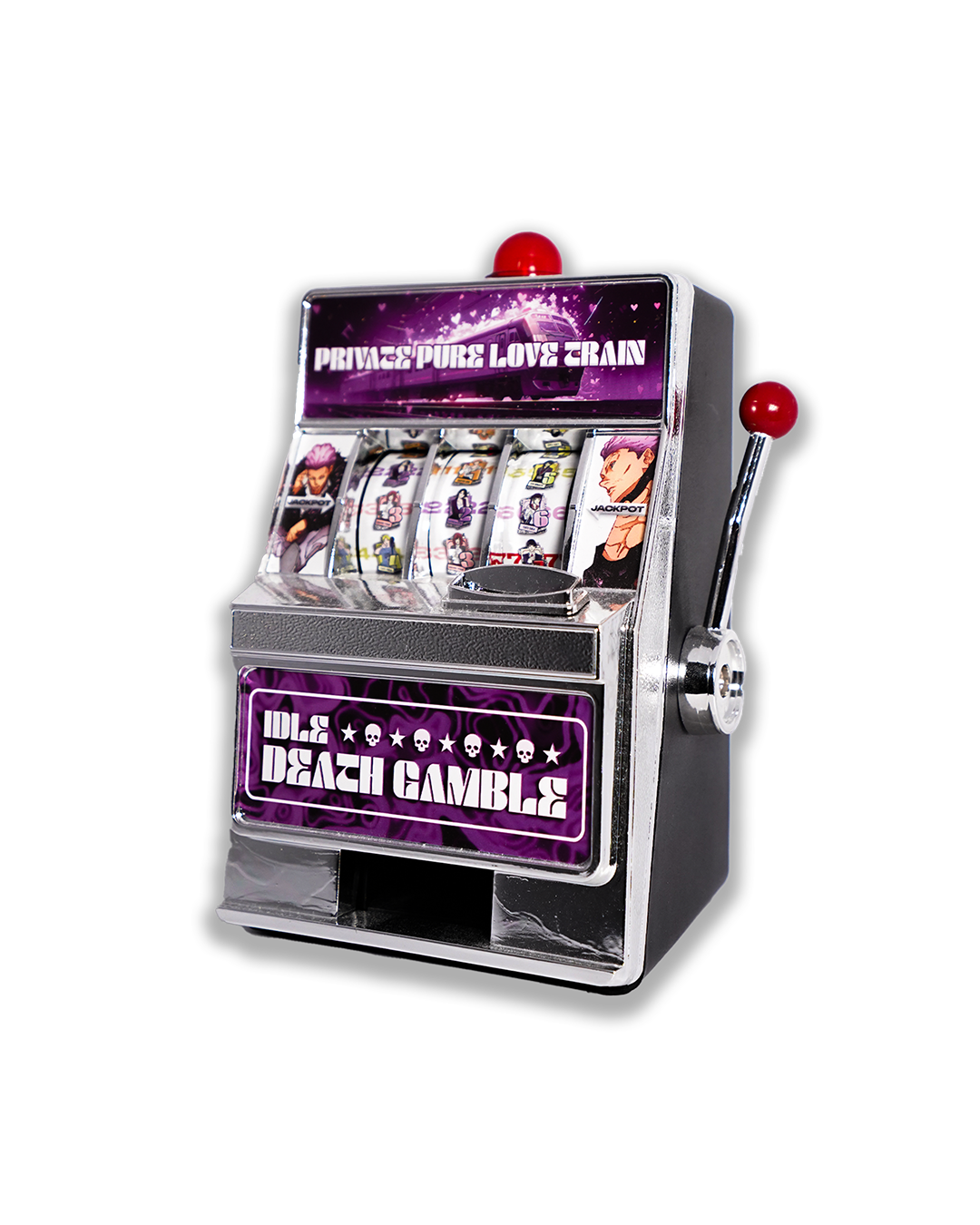 The Restless Gambler Mini Slot Machine brings the high-stakes excitement of Hakari's limitless luck to life. This unique collectible merges anime fandom with interactive design, capturing the essence of Kinji's chaotic, yet powerful, abilities in the form of a desktop accessory.